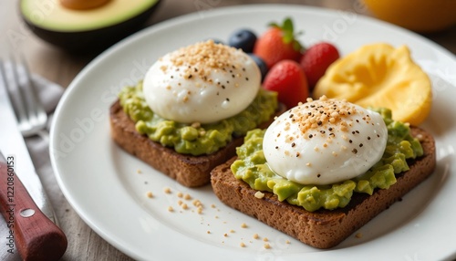 A healthy breakfast spread with avocado toast, poached eggs, and fresh fruit on a white plate. professional ocmposition with copy space for text.