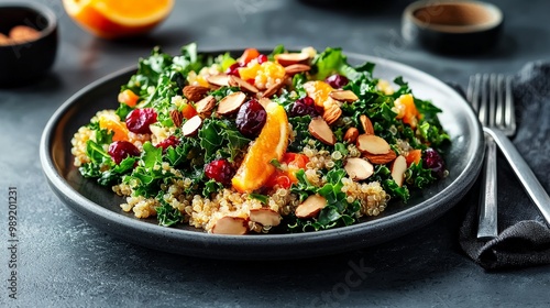 A healthy kale and quinoa salad with roasted almonds, cranberries, and a citrus vinaigrette, beautifully arranged on a ceramic plate
