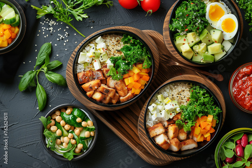 A healthy meal delivery service with pre-portioned ingredients and recipes. Various food ingredients and dishes are placed in bowls on the table