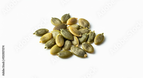 A heap of pumpkin seeds piled together on a bright white background, showing their oval shape and natural texture