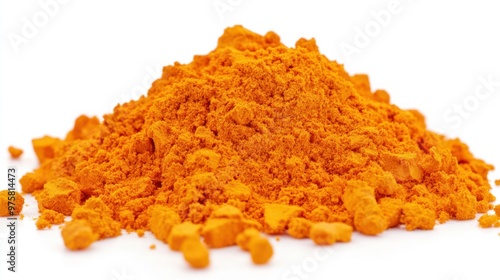 A heap of vibrant orange turmeric powder isolated on a white background, glowing in its natural color