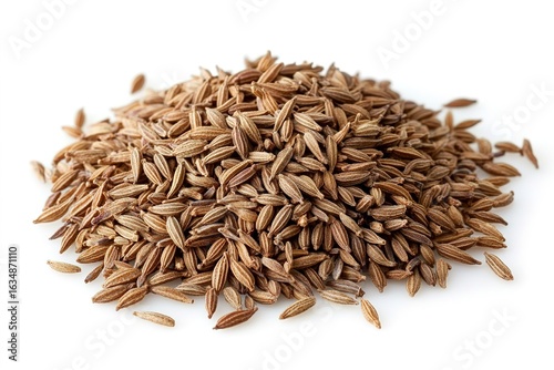 A heaping mound of whole cumin seeds with a few grains spread around, highlighting their texture and warm brown color, isolated on a white background, top-down angle