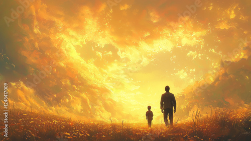 A heartbroken but hopeful father watches his son return home from a distant land, walking towards him with humility and repentance. The golden light in the sky symbolizes forgiveness and second chance