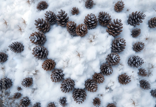 A heart-shaped arrangement of frosted pinecones lies gently on a snowy forest floor, symbolizing love and natural beauty.