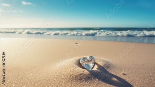a heart-shaped arrangement of rose petals on the beach sand during a seaside wedding ceremony. The gentle blue wave in the background adds a serene touch to the romantic setting.