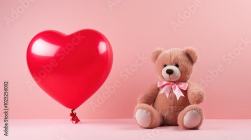 A heart-shaped balloon and a plush teddy bear on a pink background evoke themes of love, nostalgia, and gentle affection.