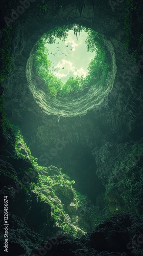 A heart-shaped opening in a cave ceiling with birds flying above and lush greenery
