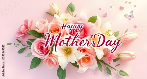 A heartwarming and beautiful Mother's Day card design, featuring soft pastel colors like pink, lavender, and peach. In the center, there’s a lovely bouquet of fresh flowers – roses, lilies, and tulips