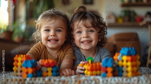 A heartwarming close-up of two siblings sitting together, sharing a toy and laughing, their faces full of joy, soft natural light illuminating their expressions,