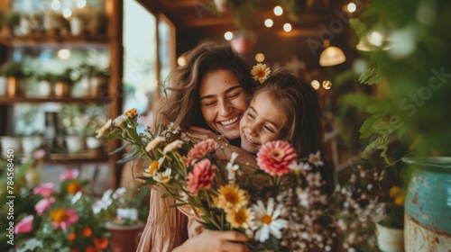 A heartwarming hug between a mother and her daughter, surrounded by a rich array of flowers, captures pure joy