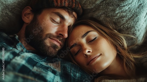 A heartwarming image of a couple cuddled close together under soft blankets, evoking warmth and intimacy in a cozy, relaxed atmosphere.