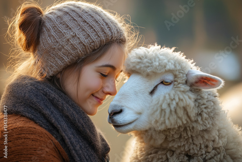 A heartwarming moment between a young woman and a fluffy sheep, sharing a gentle connection in a sun-kissed outdoor setting.