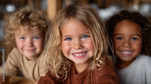 A heartwarming scene featuring three smiling children, radiating joy and happiness, captured in a natural setting with warm lighting that adds a sense of friendliness.
