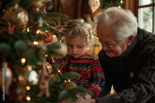 A heartwarming scene of a grandfather and a child decorating a Christmas tree together with love and joy.