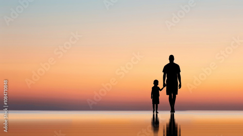 A heartwarming scene of father and son silhouettes strolling hand in hand along a sunlit beach during sunset.