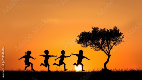 A heartwarming silhouette of kids jumping with joy by a tree on a farm as the sun sets, capturing pure childhood bliss.