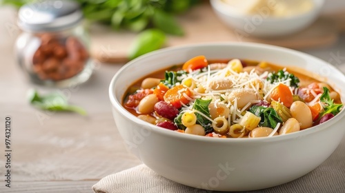 A hearty bowl of minestrone soup filled with colorful vegetables, beans, pasta, and topped with grated Parmesan cheese.