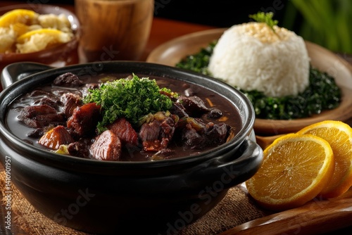 A hearty Brazilian feijoada stew, served with rice, kale, and vibrant orange slices, ready to eat.
