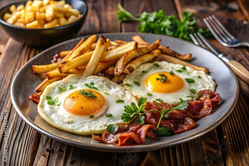 A hearty breakfast plate featuring two fried eggs, crispy bacon, golden french fries, and fresh parsley, served on a rustic wooden table