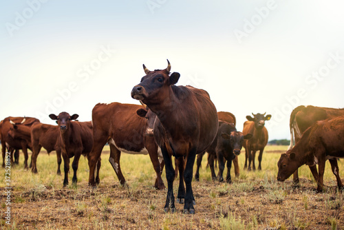 A herd of brown cows graze peacefully in a meadow with green grass. Herd of cows at summer green field. A horned brown cow stands in the center of the herd.Young and adult cows graze on a green meadow