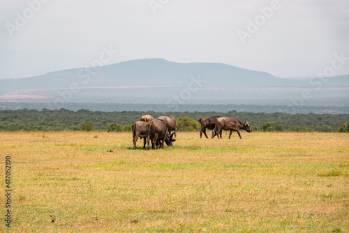 A herd of buffaloes grazing in the wild at Ol Pejeta Conservancy in Nanyuki, Kenya