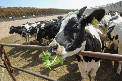 A herd of cows stands in a corral on a farm.