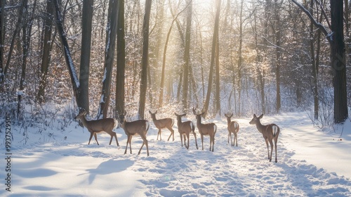 A herd of deer walking through a snowy forest, their footprints visible in the fresh snow, with sunlight streaming through the bare trees.