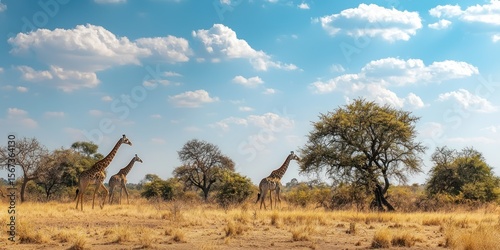 A herd of giraffes walking through the golden plains of a wildlife reserve