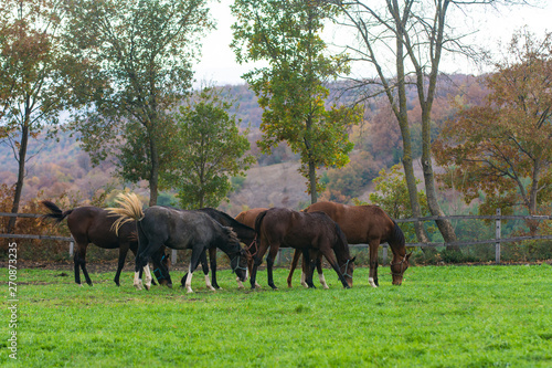 A herd of horses grazing on a farm