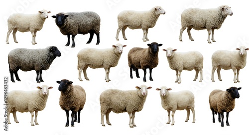 A herd of sheep in different colors and patterns, symbolizing the diversity of Qurbani animals, isolated on white