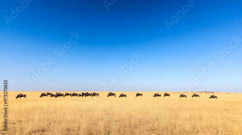 A herd of wildebeests grazing peacefully in the Serengeti, surrounded by golden grasslands under a clear blue sky
