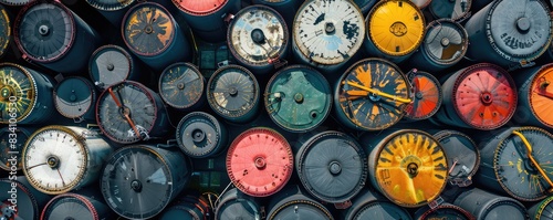 A high angle shot of several large, dark oil storage tanks, featuring intricate details of walkways and pipelines.