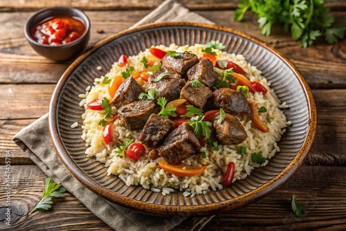 A high angle view of a plate of Aerial Rice with lamb and sauce, with selective focus