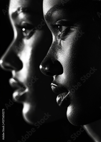 a high contrast black and white portrait of two woman, one black, one white