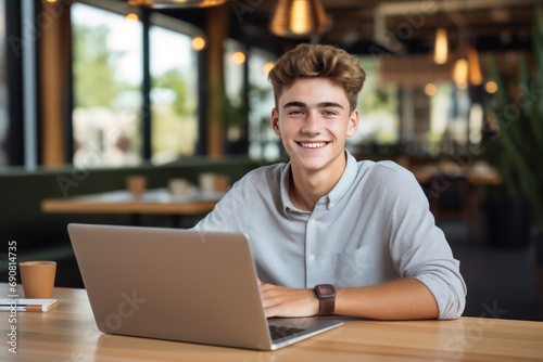 A high school male student exploring the realms of a virtual classroom, navigating his educational path with a laptop