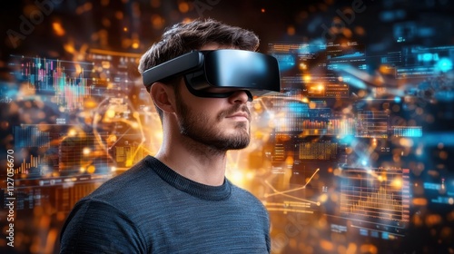 A high tech illustration portraying a man wearing VR augmented reality goggles, surrounded by abstract holographic data and graphs with multicolor projector light illumination