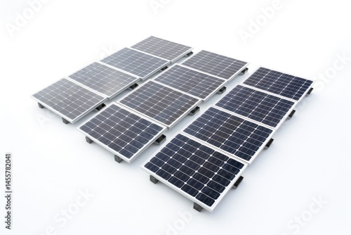 A high-angle shot of multiple solar panels arranged in rows on a rooftop under a bright sky