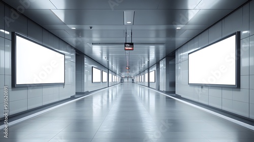 A high-ceilinged train station with blank billboards on the walls, soft, diffused lighting from hanging fixtures, wide, uncluttered walkways, and a serene atmosphere, with a focus on the emptiness
