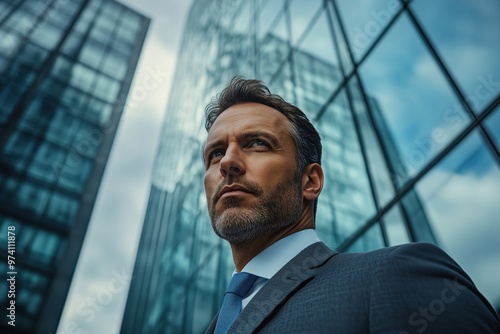 A high-contrast portrait of a businessman looking upwards, standing against the backdrop of modern glass buildings, exuding confidence and strength.