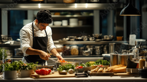 A high-end kitchen with a chef actively preparing a dish, showcasing the bright,