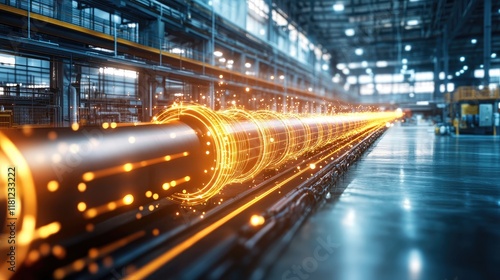 A high-energy particle collider glowing with vibrant light trails on a dark industrial background. Copy space.