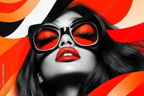 A high-fashion model showcases bold red lip color and oversized sunglasses against a dynamic abstract background featuring vibrant hues