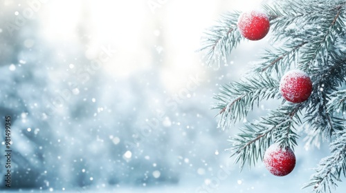 A high-key image of a winter wonderland scene, fir branches with red balls captured in soft focus, the background snowy and bright, broad space on the left for promotional text. transparent background