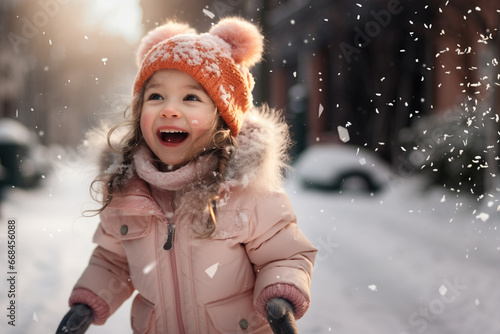 A highly detailed, full - body photograph of an adorable 4 - year - old girl playing in the snow, wearing a cute outfit.