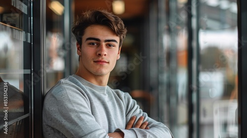 A highly detailed image of a young adult exuding confidence and enjoyment, looking at the camera with a glad expression, their individuality and lifestyle perfectly captured in sharp focus