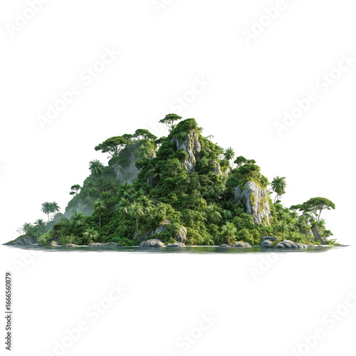 A highly detailed, photorealistic rendering of an island covered in dense jungle foliage, isolated on a white background.