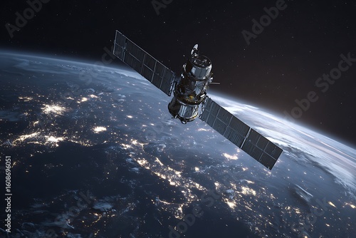 **A Highly Realistic, Cinematic Rendering Of A Communications Satellite Orbiting Earth At Night, Showcasing Vibrant City Lights Below, Crystal-Clear Cloud Formations, And The Curve Of The Atmosphere.