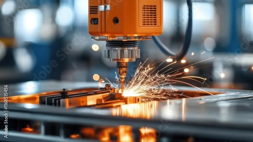 A high-precision laser cutting machine creates sparks while processing metal in a modern industrial workshop.