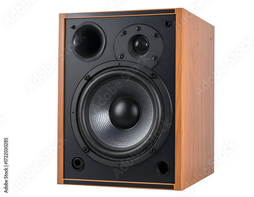 A high-quality audio speaker with a wooden finish and multiple drivers for enhanced sound performance.