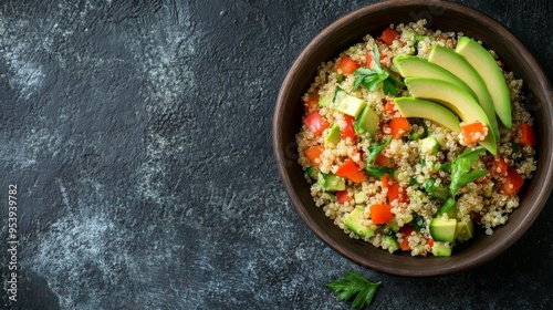 A high-quality stock image of a healthy quinoa salad with avocado on the right side, leaving space on the left for text. Ideal for health-focused content, nutritional guides, and recipe showcases.